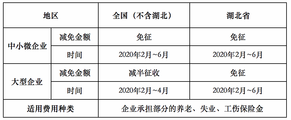 除湖北外各省份,从2月到6月可对中小微企业免征企业养老、失业、工伤保险单位缴费,从2月到4月可对大型企业减半征收;湖北省从 2 月到 6 月可对各类参保企业实行免征。同时,6月底前,企业可申请缓缴住房公积金,在此期间对职工因受疫情影响未能正常还款的公积金货款,不作逾期处理。