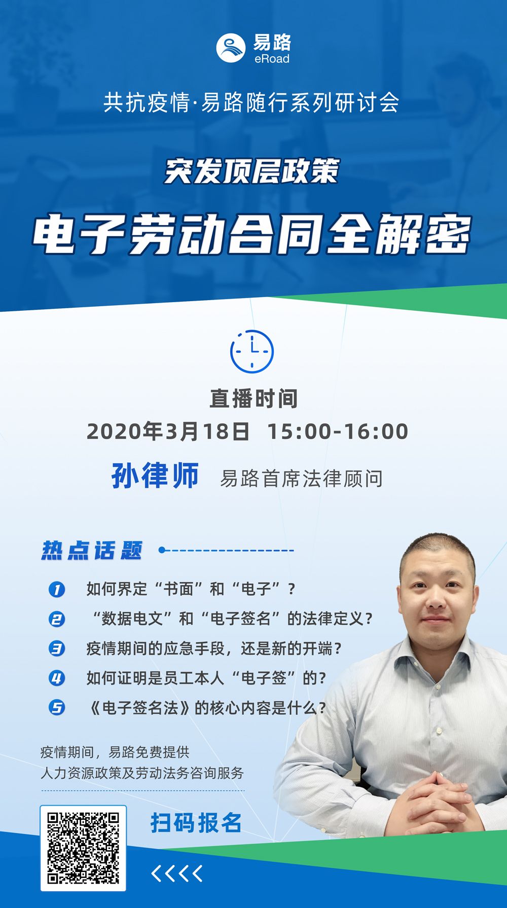 03月17日,易路 首席法律顾问 孙律师 将为大家带来《突发顶层政策,电子劳动合同全解密》,帮助企业及HR答疑解惑。