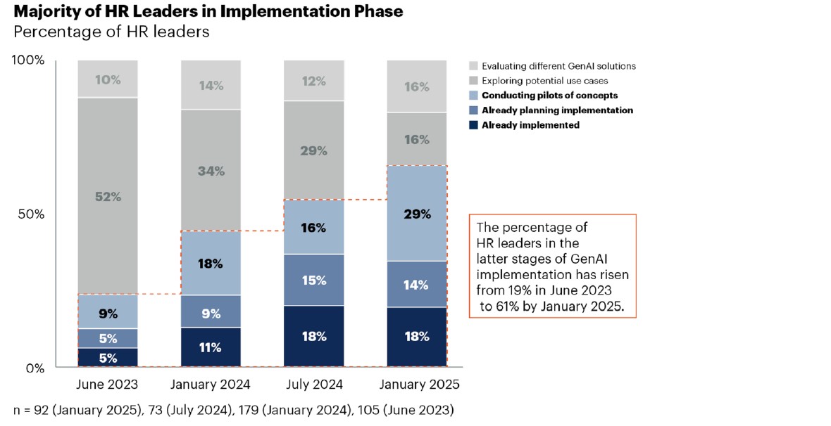 Gartner 报告指出,HR 领域 AI 应用已从过去两年的“广泛实验” 阶段,进入“战略差异化” 关键期,2025 年数据显示,61% 的 HR 领导者已处于生成式 AI(GenAI)的规划或部署阶段(2023 年 6 月仅 19%),其中 18%实现规模化落地,43% 处于试点或规划中。CHRO 对 AI 的定位已从 “效率工具” 升级为 “人才战略核心”:76%的 HR 领导者认为,若 12-24 个月内不部署 GenAI,组织将在人才竞争中落后;77% 将 “提升效率” 列为首要目标,52% 聚焦 “优化员工体验”,43% 旨在 “增强决策科学性”,三者共同构成 AI 在 HR 的核心价值支柱。