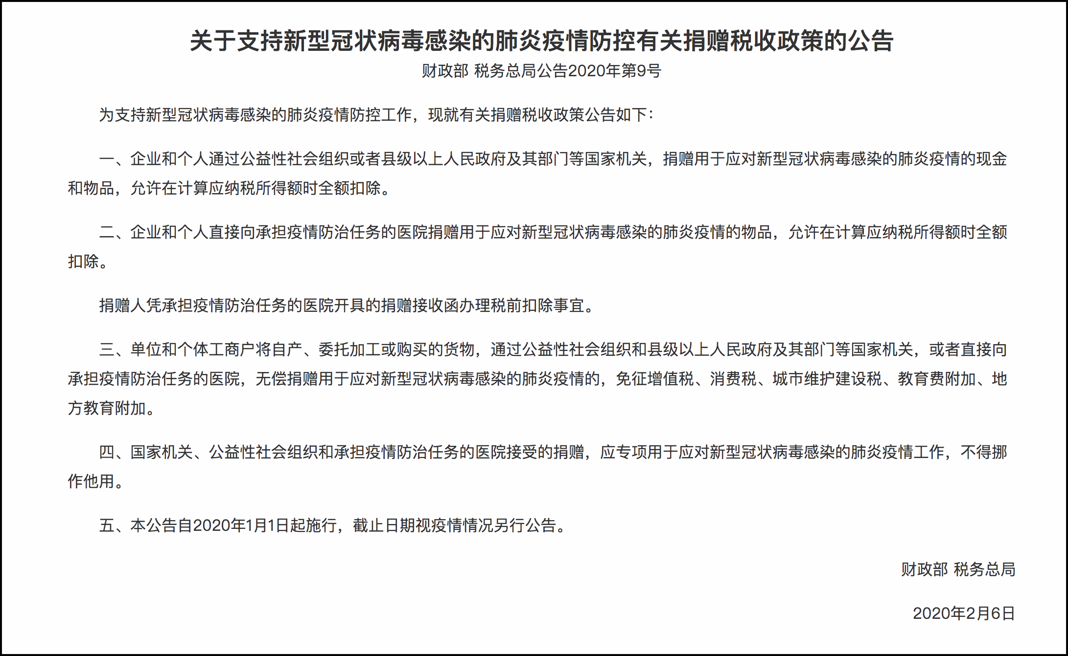 为支持此次新型冠状病毒疫情防控工作,2月6日财政部、税务总局出台了2020年第9号公告《关于支持新型冠状病毒感染的肺炎疫情防控有关捐赠税收政策的公告》。