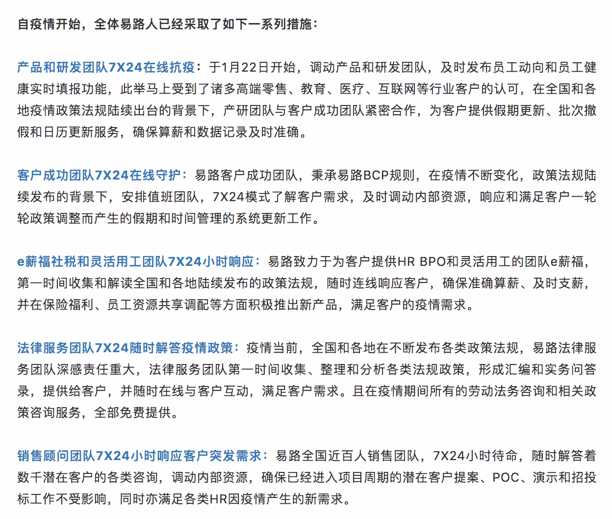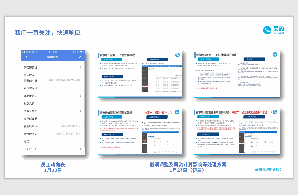 2020年春节前夕,在观察到疫情有逐渐扩散趋势的情况下,易路迅速推出全员健康信息监测模块,免费提供给客户,协助企业完成疫情期间的员工信息实时管理。春节后,随着全国各地区各种延迟复工的政策规定的相继发布,易路法律服务团队第一时间收集、整理和分析各类法规政策,形成汇编和实务问答录,并通过反复思考,提供给所有的HR黄金行动路线的建议,共同抗击疫情给企业带来的冲击。