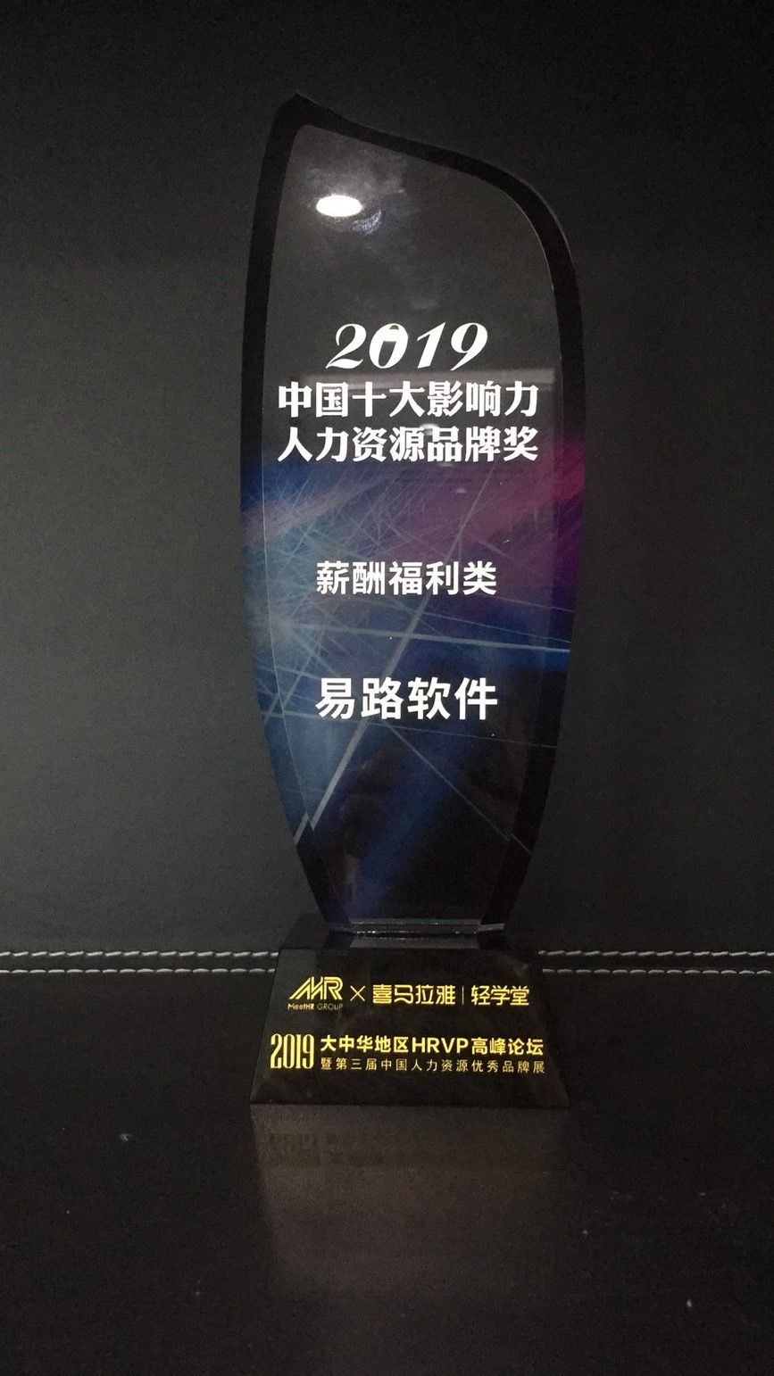 2019年9月19日,大中华地区HRVP高峰论坛于北京市富力万丽酒店召开。会上,易路凭借市场的广泛认可度和优质的产品与服务,荣获 “2019年中国十大影响力人力资源品牌奖”薪酬福利类大奖。