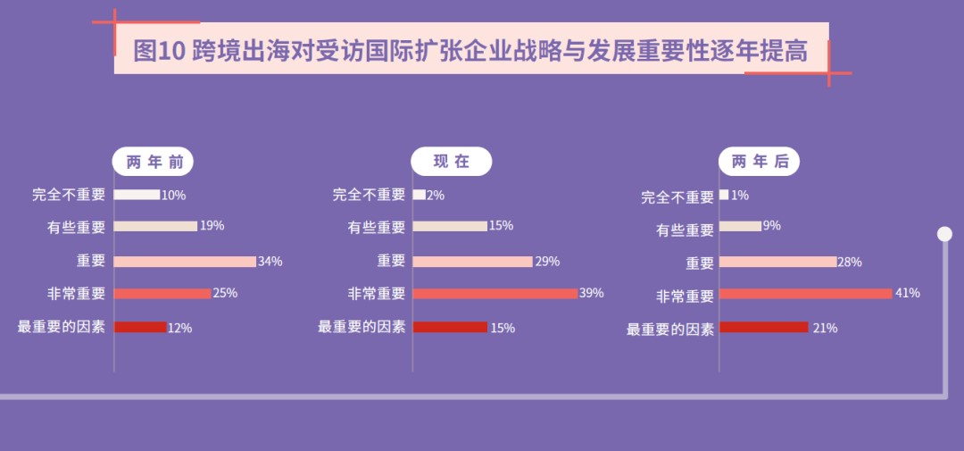 根据相关调研数据,企业对于当前出海在其战略和发展中的重要性认知显著提高。与两年前相比,认为出海“非常重要”的企业比例增加了14%,预计未来两年这一比例将达到41%。此外,目前有15%的受访企业将国际扩张视为最重要的战略因素,预计两年内这一比例将持续增长至21%。这意味着,在未来两年内,跨境出海将成为超过六成企业战略中“非常重要”的组成部分。