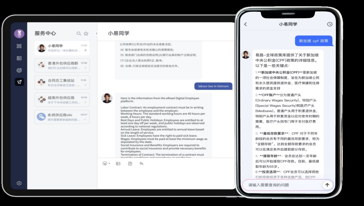 AI与专家智库支持: 易路AI机器人可以满足7*24小时不间断应答,已涵盖全球120多个国家人事相关政策法规,支持企微、微信、钉钉、飞书多渠道接入,后台可联动OA、ERP等多个内部平台及外部系统,调用人事数据,触发自助服务窗口,实现薪资明细查询、报销、请休假等服务。