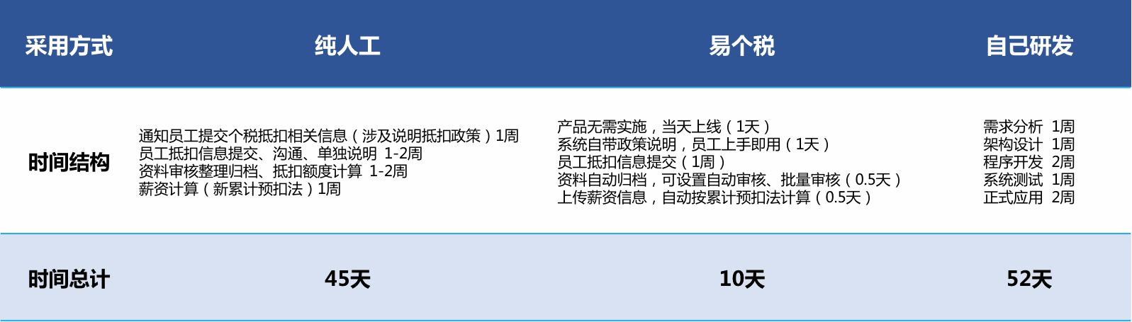 19年1月份,个税抵扣政策即将落地。可能在1月10日或15日企业发薪的时候,员工就已经可以享受个税抵扣的政策,减轻个人税负了。如果错过1月份发薪日,那么1月份的个税,就需要按照未抵扣的情况给员工缴纳,员工可能就要到次年汇算清缴的时候才能退税,那么,为了能够在1月份,进行抵扣,我们为大家预估了一个时间表,纯人工与依靠自己研发的时间仅供参考,可能更快,也可能会需要更多的时间。