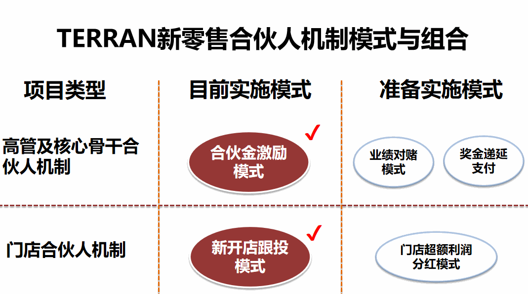 在这两个业务板块管理总部和全国各零售门店全面实施合伙人计划,薪酬收入50%股权化、分红化、奋斗化。