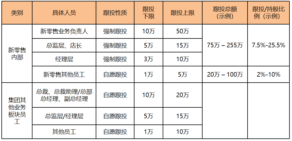 假设一家门店的投资额为1000万,公司拿出30%为跟投比例,只有强制跟投款入账后,剩余可跟投额度开放给自愿跟投的员工,优先新零售内部员工。跟投金额采取“就低不就高”的原则。