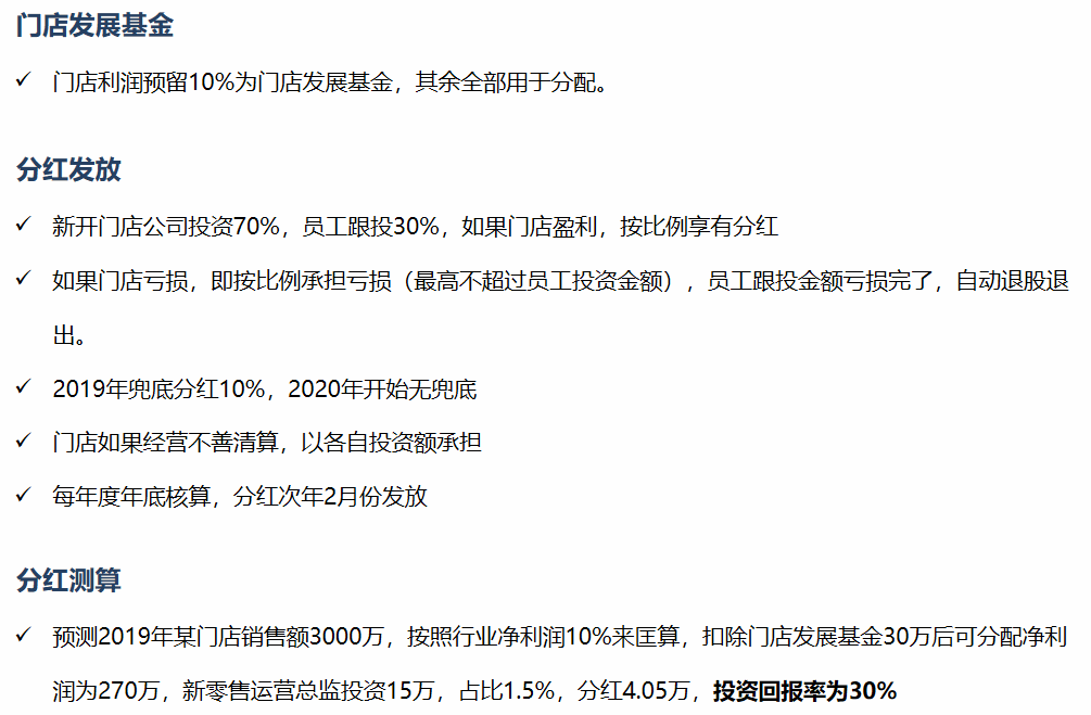 门店团队入股,为门店持续快速复制拓展提供资金端的支持。