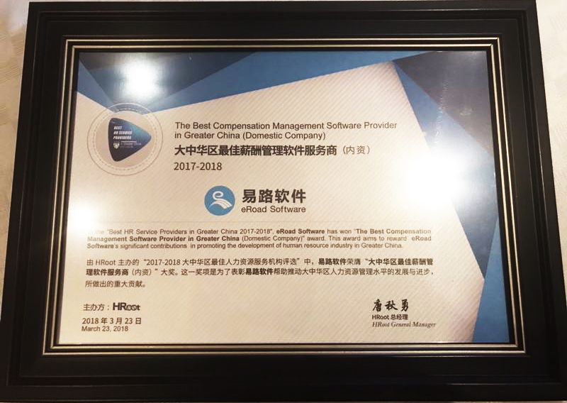 【快讯】在刚刚结束的由《人力资本管理》杂志与HRoot主办的“2017-2018大中华区最佳人力资源服务机构评选-Best HR Service Providers in Greater China 2017-2018”中,易路软件荣膺“大中华区最佳薪酬管理软件服务商”。