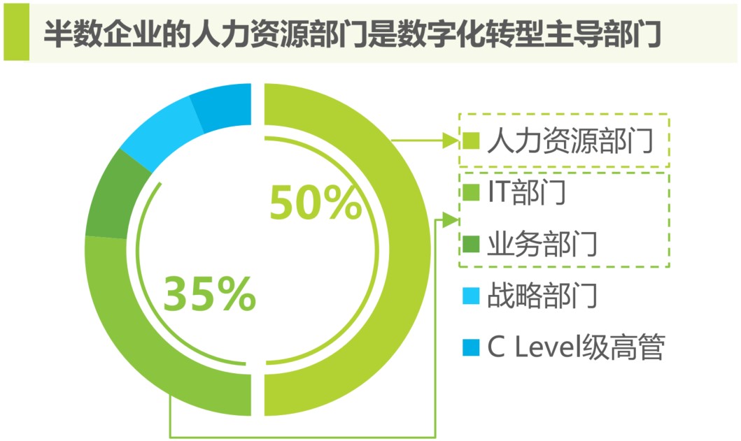 数据显示,当前97%的企业已经开始着手数字化建设,以人力资源部门发起数字化转型为主,部分企业由IT部门统筹全公司数字化架构搭建,部分外资企业战略部门也承担统筹管理角色。