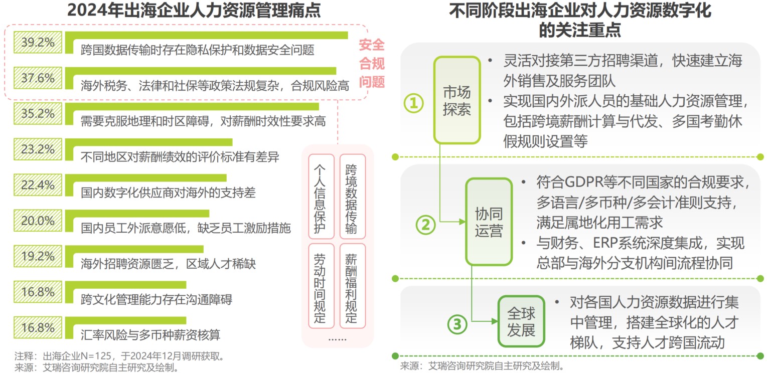 安全合规是生命线,这其中既包括数据安全、隐私保护等问题,也涉及海外劳动法及雇佣条例对考勤、薪酬等方面规定。故出海企业人力资源数字化应秉承业务先行的原则,分阶段实施、逐步推进全球化建设。