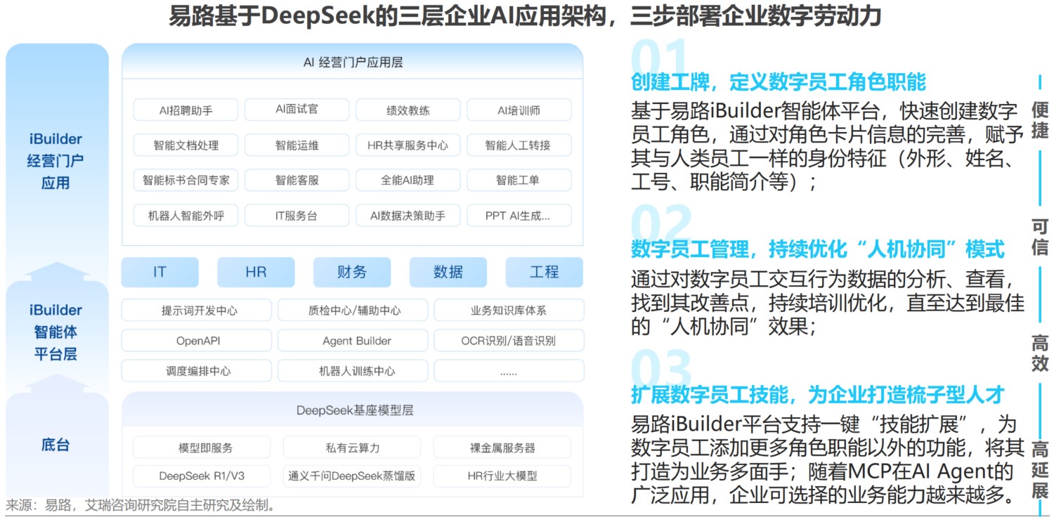 作为人力资源领域的AI先行者,易路在AI+HR领域布局早,其iBuilder智能体平台基于HR行业大模型、DeepSeek模型、ChatGPT等研发并内置38个智能体,成为AI-HR全场景深度融合引领者。